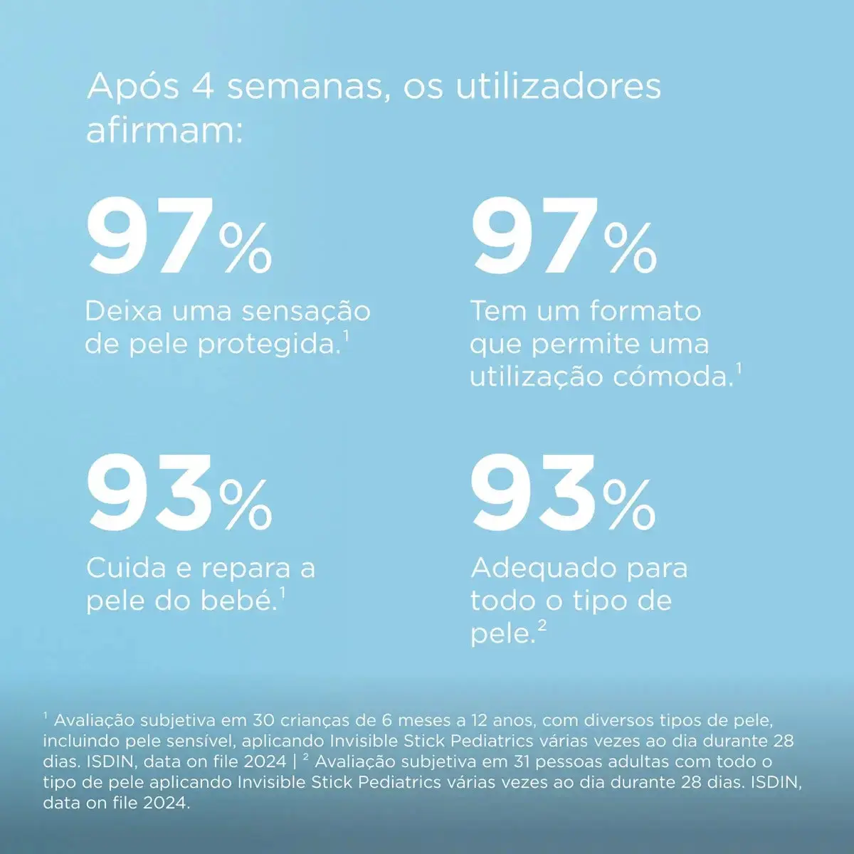 Proteja as zonas mais sensíveis e expostas da delicada pele da criança com o Pediatrics Stick SPF 50, o protetor solar em stick muito resistente à água e resistente ao suor, que se aplica confortavelmente e se absorve de forma imediata. Proporciona uma hidratação intensa, ação antioxidante e reforça a função barreira. BENEFÍCIOS A importância de proteger a pele da criança As queimaduras solares durante a primeira infância estão associadas a um maior risco de cancro de pele na idade adulta.