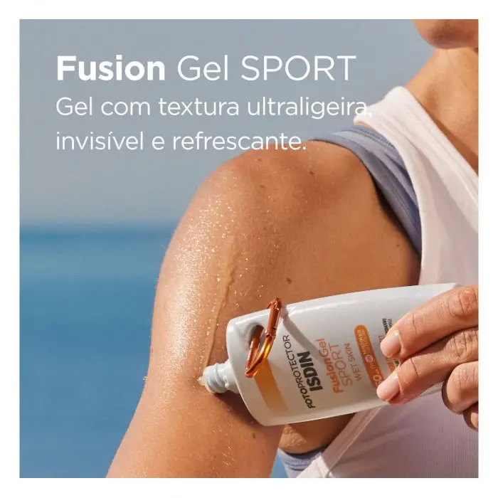 Isdin Fotoprotector Sport Fusion Gel proporciona uma proteção solar eficaz, enquanto refresca o corpo durante a prática desportiva. • Combinação de filtros UV, tecnologia Fusion e Wet Skin para uma ação protetora, hidratante, refrescante e equilibrante • Associa extrato de gengibre para um efeito antioxidante que combate o dano oxidativo das células • Proteção solar muito elevada (FPS50) • Hidrata e proporciona uma agradável sensação de frescura • Equilibra a temperatura corporal durante o exercício físico (cooling down effect) • De rápida absorção, pode ser aplicado na pele molhada • Não deixa marcas brancas • Ideal para zonas pilosas e couro cabeludo • Pode ser usado no rosco, braços e pernas • Textura em gel fresco, sem óleo • Fórmula Sea Friendly • Dermatologicamente testado • Inclui um gancho para levar o protetor